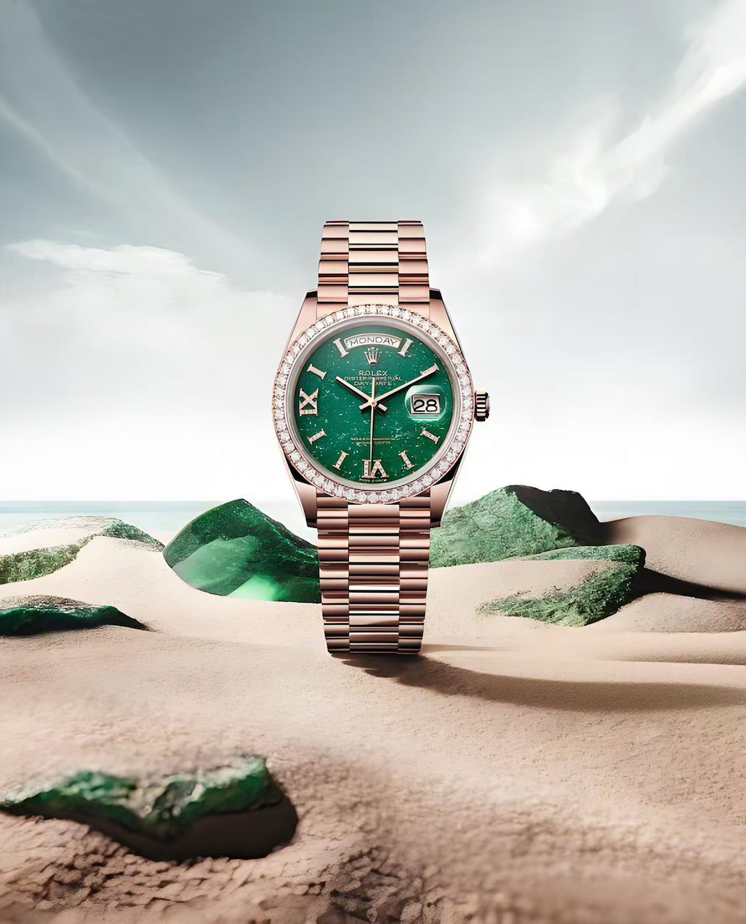 虽然矿物宝石不是劳力士这一轮彩虹风潮的中心,但劳力士2023年推出绿色砂金石、红玉髓及绿松石、以及彩色珐琅拼图表盘的星期日历型,也算是对自家历史的致敬。