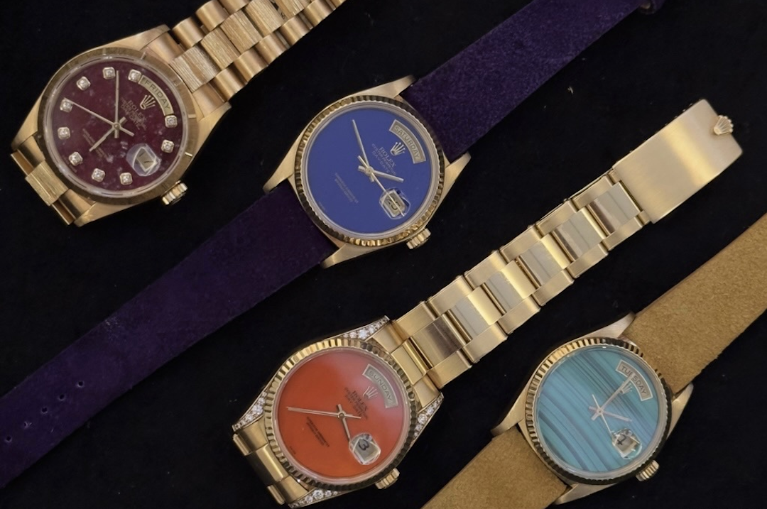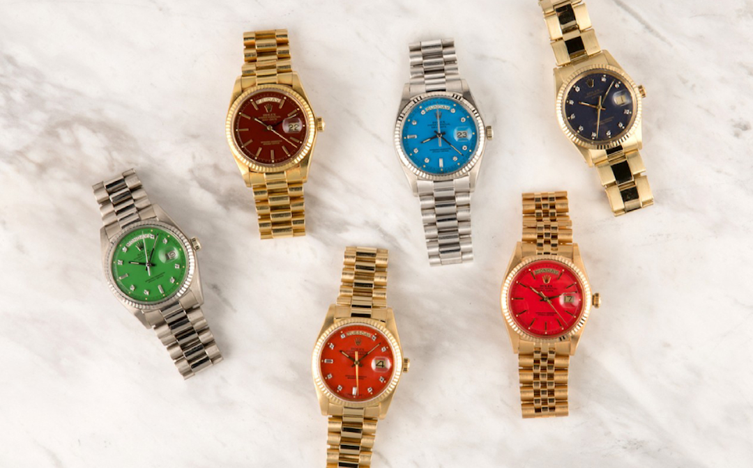 劳力士“Stella”彩漆宇宙始于1970年代,最初也是用于星期日历型,红、橙、黄、绿、蓝、紫,彩虹色应有尽有。
