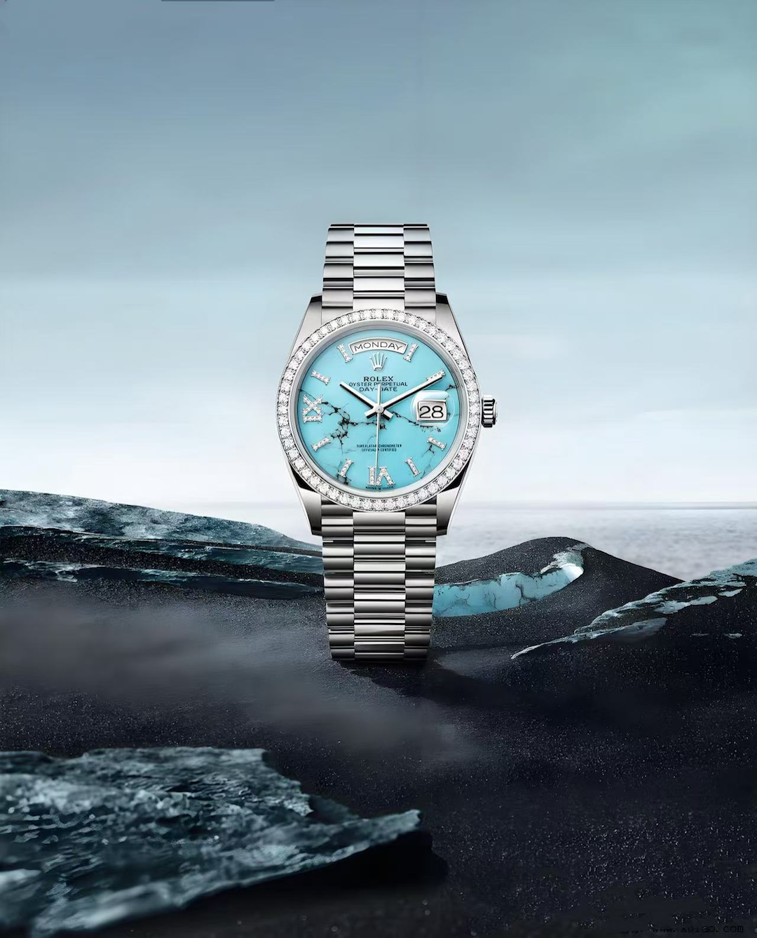 同一时期,劳力士也开始运用天然矿物打造星期日历型腕表,有缟玛瑙、黑曜石、青金石、绿松石等。