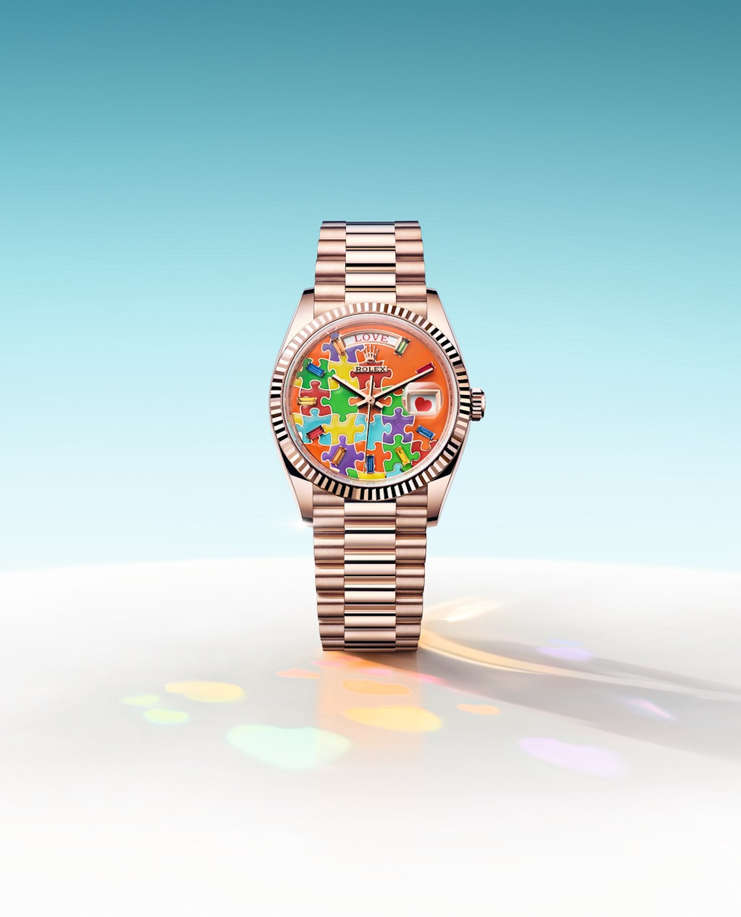 随后绿色表盘一度从运动表领域流淌到正装表盘之上,再往后并没有一个单一色彩承接绿色的接力棒,而是本文主角,“彩虹盘”建立了更丰富多彩的新世界。